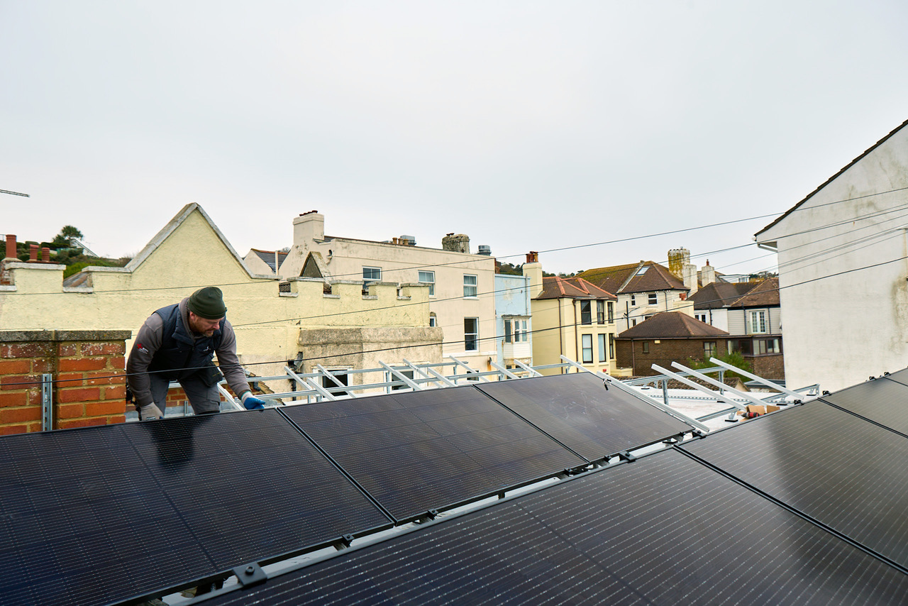 It was time for a rethink. Peter Hickman approached Kevin Blackman from Emerald Electrical in Hythe to take a look at the issue of how to secure the panels without compromising the waterproof membrane on the roof. The innovative solution is described more fully below.